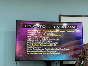 Dalam diskusi bersama akademisi dari Faculty Economics and Management University Kebangsaan Malaysia, topik yang diangkat berfokus pada pengembangan kurikulum berstandar internasional, penerapan Outcome-Based Education (OBE), serta strategi penguatan kompetensi lulusan di era global.